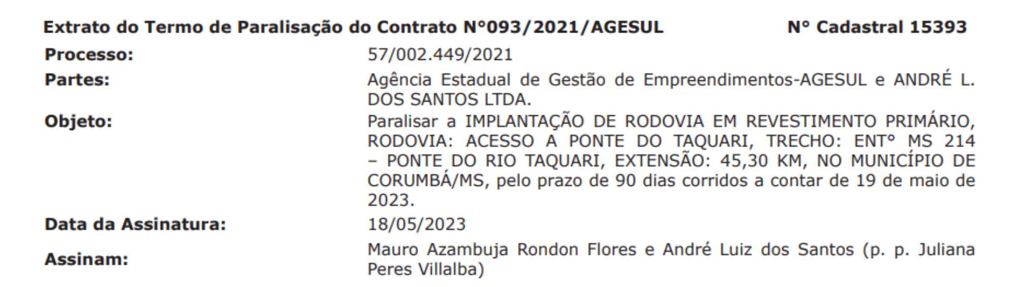Conforme publicação no DOE (Diário Oficial do Estado) feita na quarta-feira (21), a paralisação feita por intermédio da Agesul (Agência Estadual de Empreendimentos) refere-se à obra de cascalhamento no acesso à ponte do Taquari, com 43,3 km de extensão, em Corumbá. A obra fica paralisada por três meses com data a contar a partir de 19 de maio.