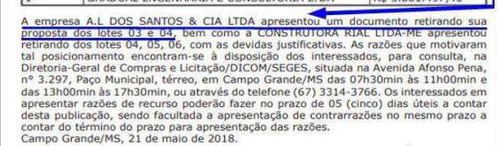 Ainda conforme o Portal da Transparência da Prefeitura de Campo Grande, os contratos foram assinados pelo então secretário de Infraestrutura e Serviços Públicos, Rudi Fiorese.