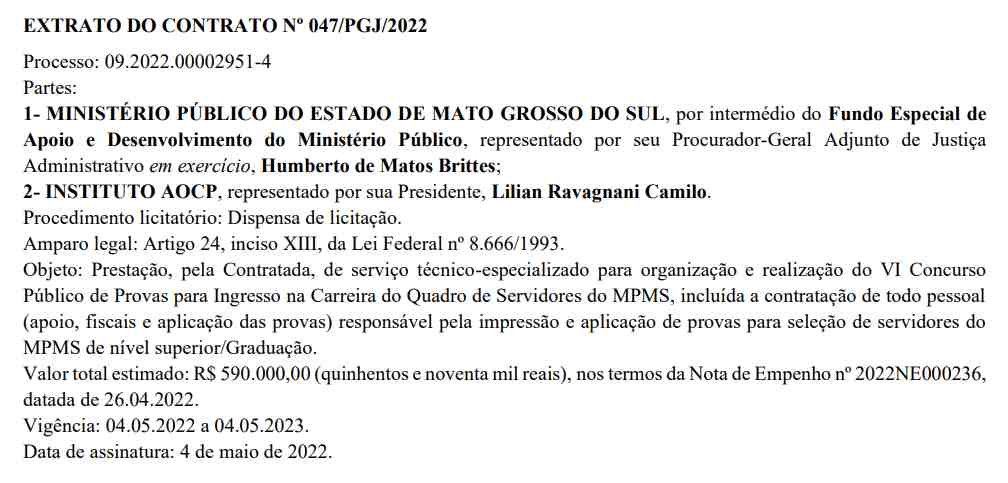 A publicação foi feita em 5 de maio de 2022, no Diário Oficial do MPMS (Ministério Público de Mato Grosso do Sul). O instituto ficaria responsável pela organização e realização do VI Concurso Público de Provas para Ingresso na Carreira do Quadro de Servidores do MPMS.