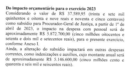 Reajustando o salário dos procuradores, o salário dos promotores também será aumentado. Na própria lei, o MPMS admite que o impacto financeiro para o órgão será de R$ 5,8 milhões somente com salários, mais R$ 5,1 milhões com os penduricalhos, ou seja, R$ 11 milhões. Isso só para o ano de 2023.
