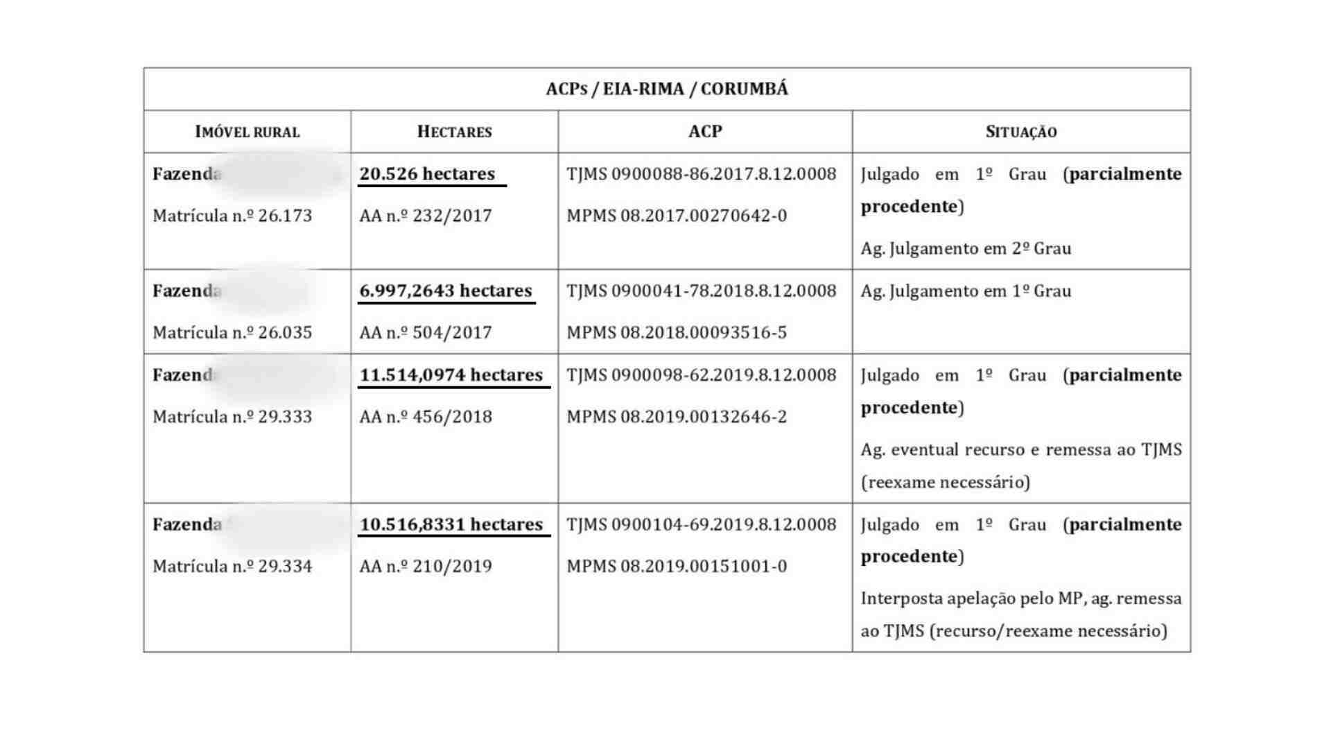 Os pedidos de desmatamento, que se baseiam em decreto estadual de 2015, já foram julgados procedentes pela Justiça Estadual, na Comarca de Corumbá. Ainda não se sabe, no entanto, se os desmates já foram executados em sua totalidade em todas as quatro áreas.
