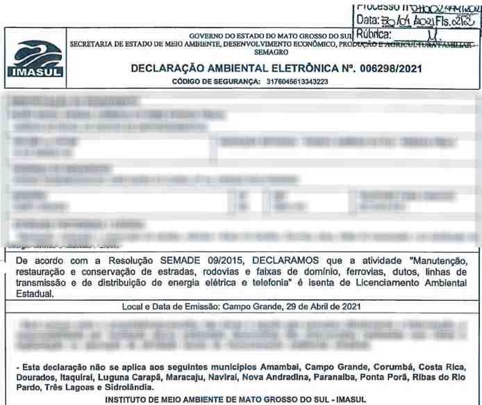 Em 2021, declaração ambiental do Imasul (Instituto de Meio Ambiente de Mato Grosso do Sul) traz trecho da resolução 09/2015 da Semade (Secretaria de Estado de Meio Ambiente e Desenvolvimento Econômico), do secretário Jaime Verruck.