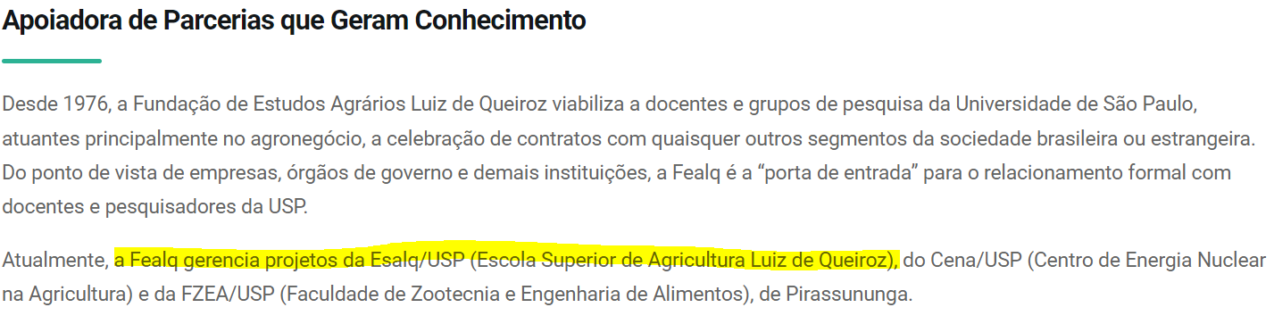 A Fealq é a instituição, conforme o próprio site institucional da entidade, que gerencia os projetos da Esalq-USP (Escola Superior de Agricultura Luiz de Queiroz da Universidade de São Paulo), ou seja, os contratos para estudos tocados pela Esalq são assinados pela Fealq.