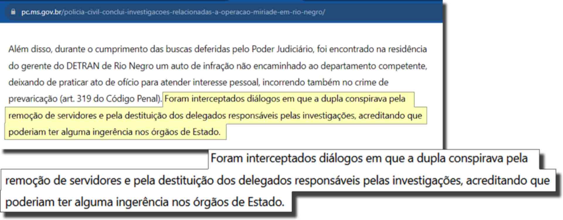 Notícia do Midiamax de setembro deste ano apontou que interceptação de diálogos entre o ex-gerente e o então gerente do Detran-MS, Gênis Garcia Barbosa e Joaci Nonato Rezende, flagrou tentativa de destituir delegados responsáveis pelas investigações da Operação Miríade.