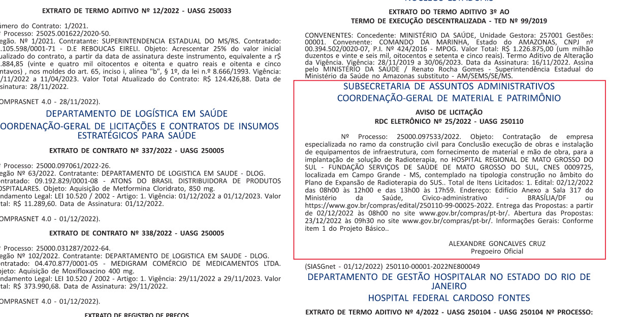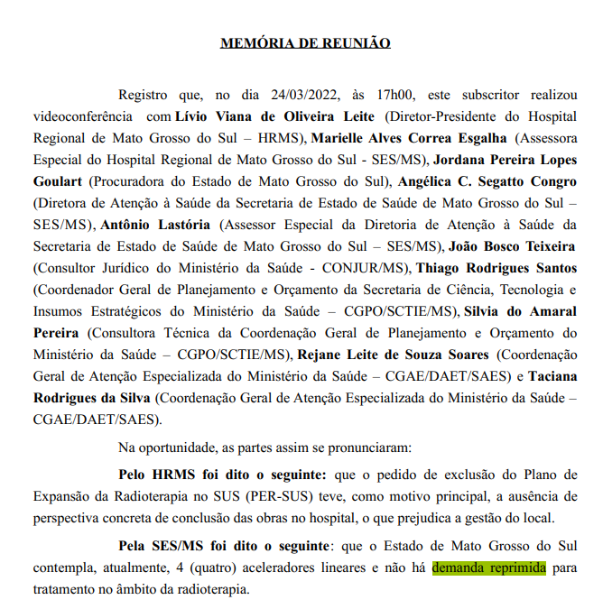 A informação foi reforçada pela SES-MS em reunião com o MPF, por videoconferência, em março de 2022. O então assessor especial da Diretoria de Atenção à Saúde da SES, Antônio Lastória, afirmou que Mato Grosso do Sul não registrava demanda reprimida para tratamento de radioterapia.