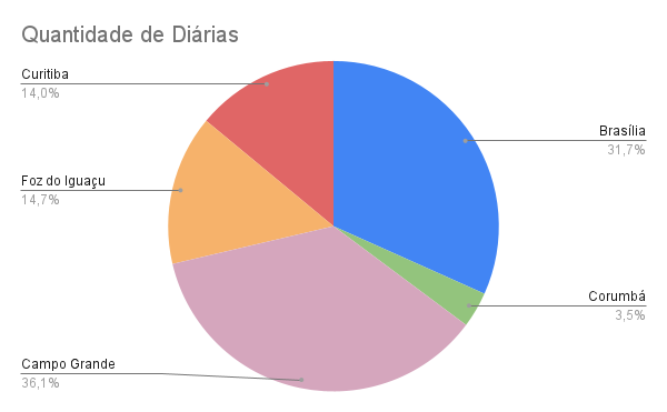 Entre os destinos das diárias estão: Campo Grande, Brasília (DF), Curitiba (PR), Corumbá (MS) e Foz do Iguaçu (PR). Campo Grande foi o destino com mais diárias pagas, com 155 cadastradas. Enquanto Brasília teve 136, Corumbá registrou 15, Curitiba 60 e Foz do Iguaçu 63.