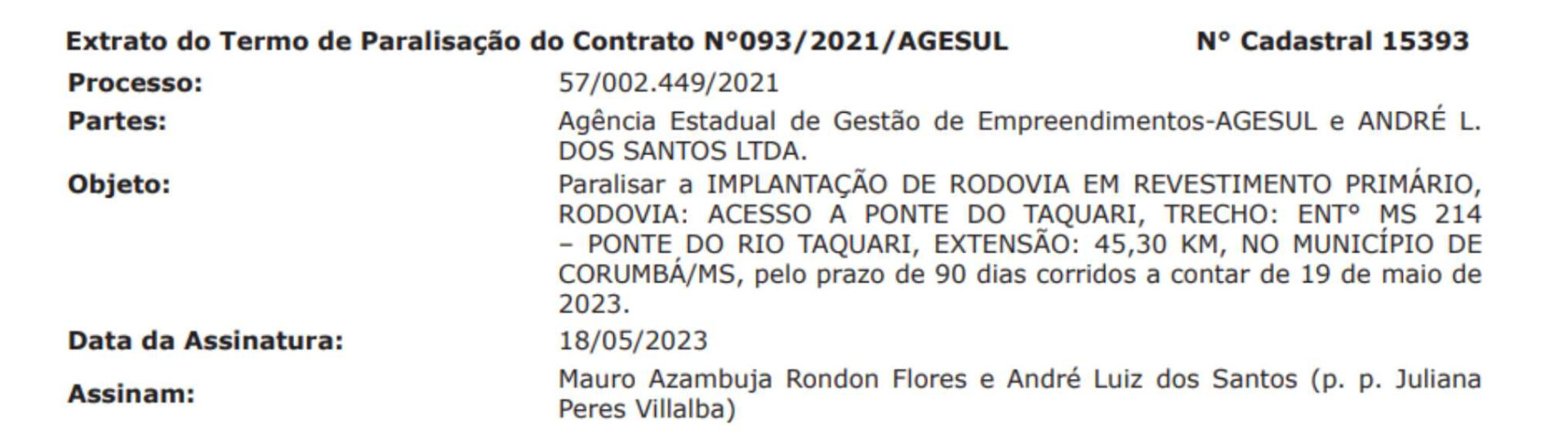 A publicação, assinada por Mauro Azambuja Rondon Flores, saiu no DOE (Diário Oficial do Estado) na última quarta-feira (21) e se refere à obra de cascalhamento no acesso à ponte do Taquari, com 43,3 km de extensão, em Corumbá. O prazo da paralisação é de três meses.