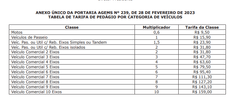 O reajuste tarifário anual dos valores de pedágio cobrados pela utilização, como meio de transposição, da ponte rodoviária de concreto armado edificada sobre o Rio Paraguai, na Rodovia BR-262, no trecho entre os Municípios de Miranda e Corumbá, correspondente a 12,77%, segundo a publicação.