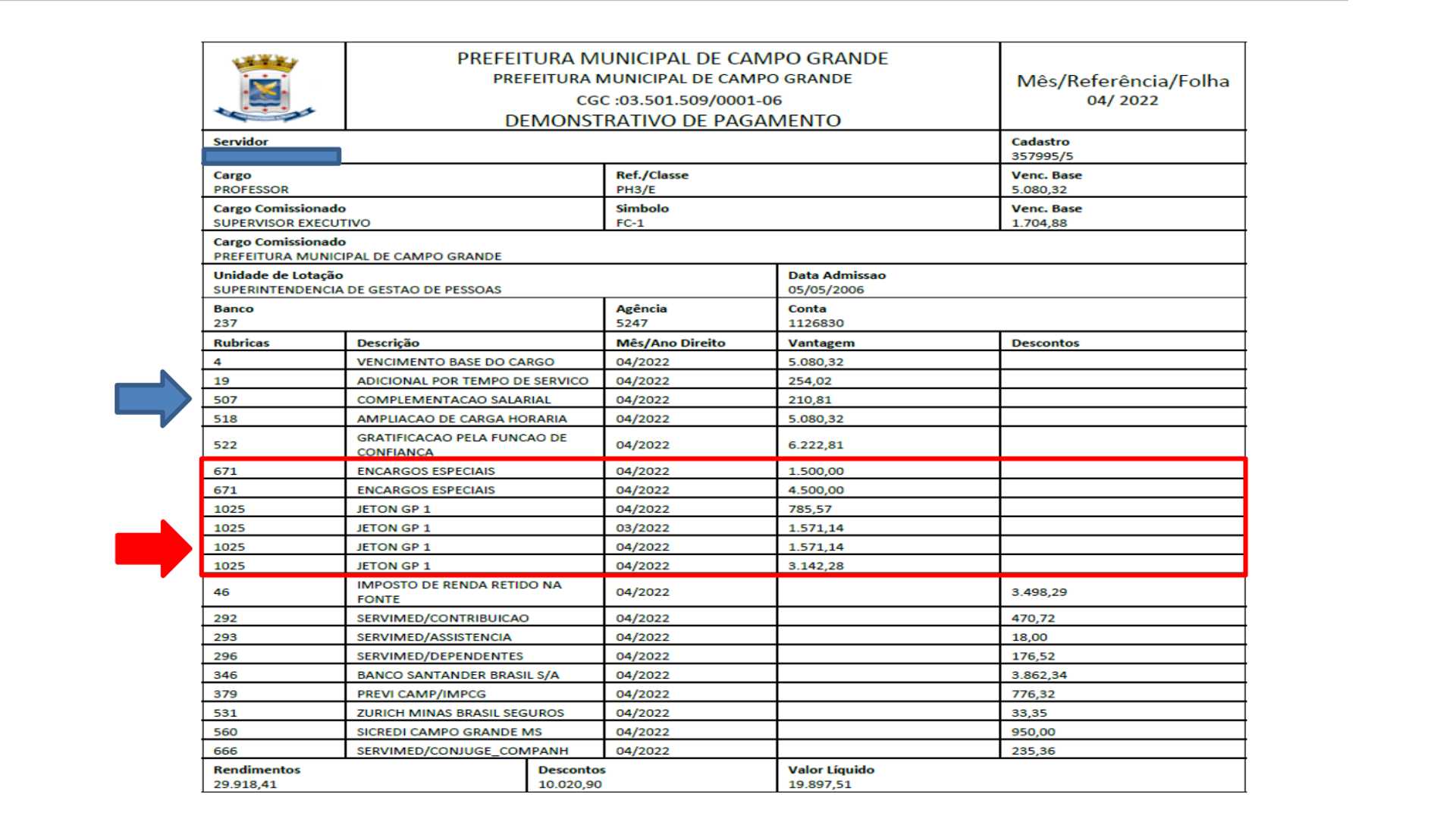 Além disso, o professor ainda ganha mais R$ 6 mil por encargos especiais, outros R$ 7 mil por jetons, R$ 254,02 por adicional por tempo de serviço e R$ 210,81 a título de complementação salarial. Isso resulta num vencimento bruto de R$ 29,9 mil, que com os descontos de R$ 10 mil, levou ao pagamento de R$ 19,8 mil.