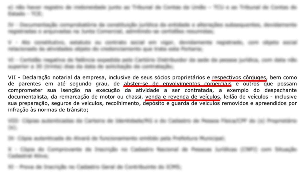 Ainda, no inciso VIII, consta que “inclusive de seus sócios proprietários e respectivos cônjuges, bem como de parentes em até segundo grau, de abster-se de envolvimentos comerciais e outros que possam comprometer sua isenção na execução da atividade a ser contratada” e cita exemplos como despachante, remarcação de motor ou chassi, venda e revenda de veículos, leilão de veículos e outros.