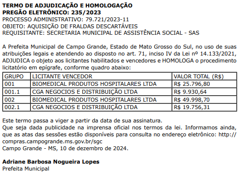 A Prefeitura de Campo Grande divulgou, nesta terça-feira (17), o resultado da licitação para compra de fraldas descartáveis. O termo de adjudicação e homologação pregão eletrônico 235/2023 consta no Diogrande (Diário Oficial de Campo Grande), na página 5.