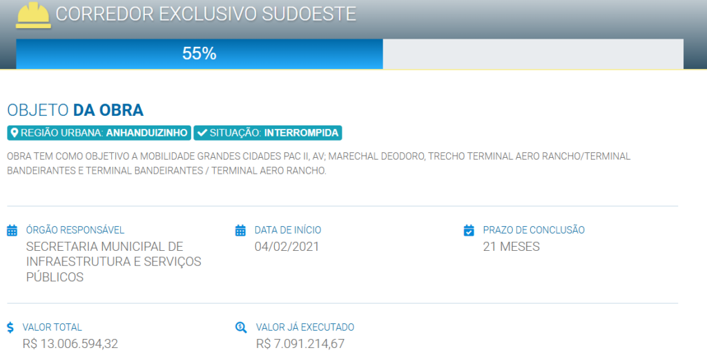 O Portal +Obras da Prefeitura de Campo Grande mostra que a obra, que está parada há meses, chegou aos 55% de execução.
