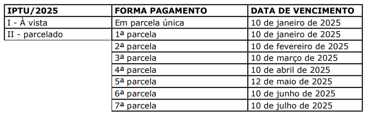 O imposto poderá ser pago à vista até 10 de janeiro de 2025. Na mesma data também vencerá a primeira parcela para quem optar por pagar em 12 vezes. Já a última parcela vencerá em 10 de dezembro.