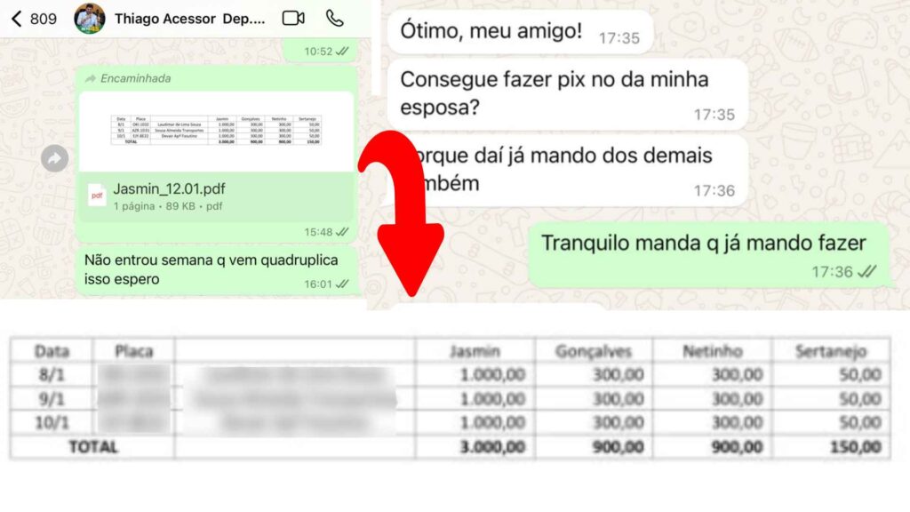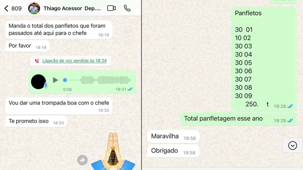 Depois, em troca de mensagens, David cumpre o combinado e envia o que eles chamam de ‘panfletos’. Primeiro, Thiago pede para o despachante enviar os ‘panfletos’ que foram repassados ao ‘chefe’, que é como os integrantes da quadrilha chamavam Beto Pereira.