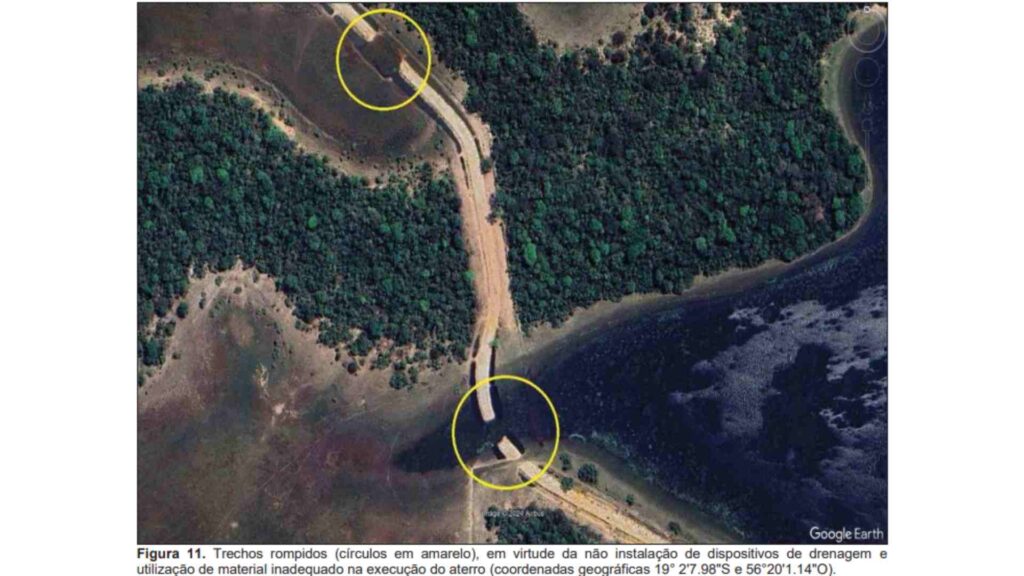Em outro ponto, a equipe técnica rebate justificativa da Agesul para abrir a rodovia naquele local. “A justificativa da AGESUL para ampliação da malha rodoviária na região é de que a implantação da Rodovia MS-228 proporcionaria uma melhora na logística e consequente redução do custo de transporte, com contínuos investimentos na boa qualidade de rodovias não-pavimentadas. No entanto, de acordo com a vistoria técnica realizada pela equipe do DAEX, foi possível constatar, a partir do trecho da região do Chatelado, péssimas condições de trafegabilidade na rodovia implantada e significativa degradação ambiental“.