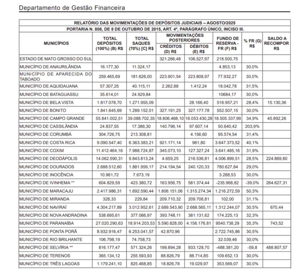 O Tribunal de Justiça de Mato Grosso do Sul divulgou o relatório de movimentação dos depósitos judiciais de 25 municípios referente a agosto de 2025. Foram recolhidos ao todo R$ 257.332.747,35.