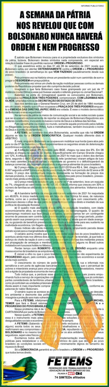 A FETEMS (Sabendo que essa não é tarefa exclusiva de poucos e nem de alguns) exorta todos os seus filiados, demais trabalhadores e agentes políticos a reafirmarem seu compromisso com a DEMOCRACIA, repudiando o comportamento de BOLSONARO e no mesmo tom e firmeza repudiar os atos antidemocráticos dos seus seguidores, sejam eles físicos ou digitais.