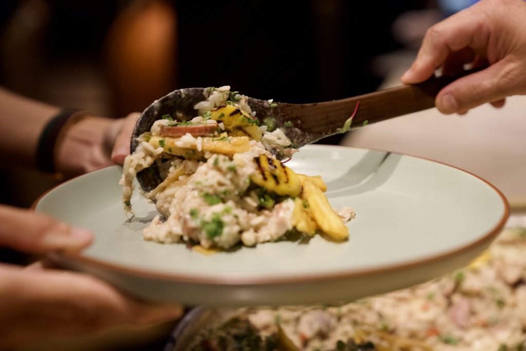 Arroz com natas e queijo caipira e caldo de galinha caipira, linguiça de Maracaju, carne de sol, filé de pacu, frango, copa suíno, bacon, calabresa defumada, banana da terra, crocante de mandioca e farofinha de torresmo. Finalizada com espuma de carvão