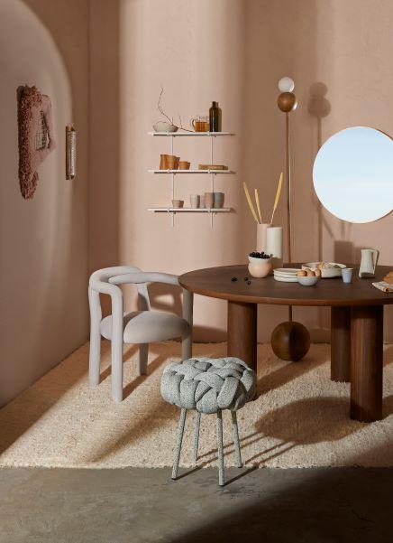 Ambiente que materializa A Exausta - Mesa @estudiorain; sobre ela, cerâmicas @nydiarocha_atelier; cadeira cinza @wentz.design, banquinho @humbertodamata; luminária @bonni.design; na parede tapeçaria @_alexrocca, ralador Mercado de Recife na @feiranarosenbaum; estante @estudioparrado; sobre ela, cerâmicas @nydiarocha_atelier e jarra @nodacozinha; tapete @aveia.tapeçaria na @feiranarosenbaum
