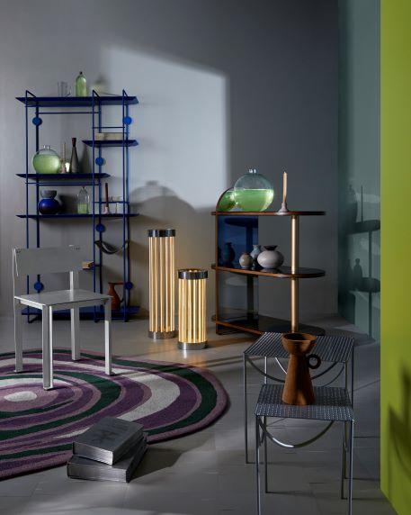Ambiente que materializa A Cibernética - Estante @f.studio_design; sobre ela, objetos @nodacozinha e @alva_design; cadeira @c.l.u.b.e. e @luizsolano_; luminárias @athas_design; carrinho @bianca_barbato; sobre ele, objetos @nodacozinha, @alva_design e @universo.produtos; mesinhas laterais @luisaattab; sobre ela, castiçal @aterraestudio; livros (prateados) @bianca_barbato; tapete @lolamuller; pisos @tarkettbrasil