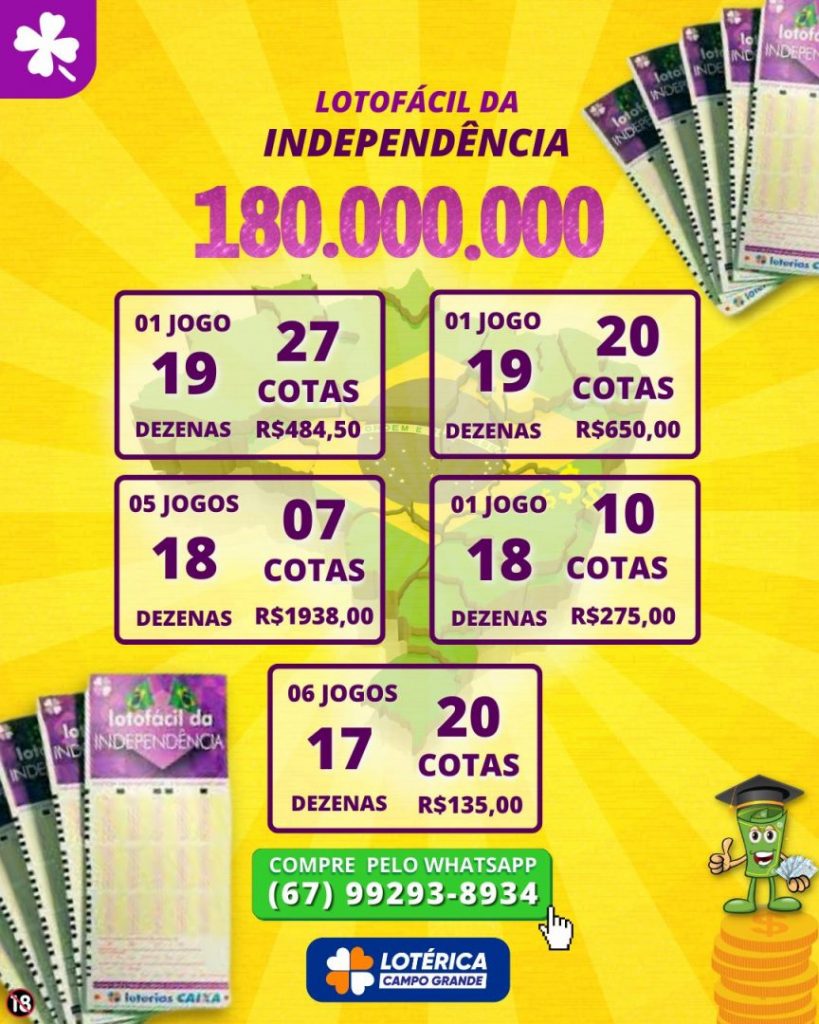Na LOTÉRICA CAMPO GRANDE você pode comprar pelo WhatsApp e ter muitas mais chances de ganhar, bolões de 20, 19, 18 e 17 dezenas.