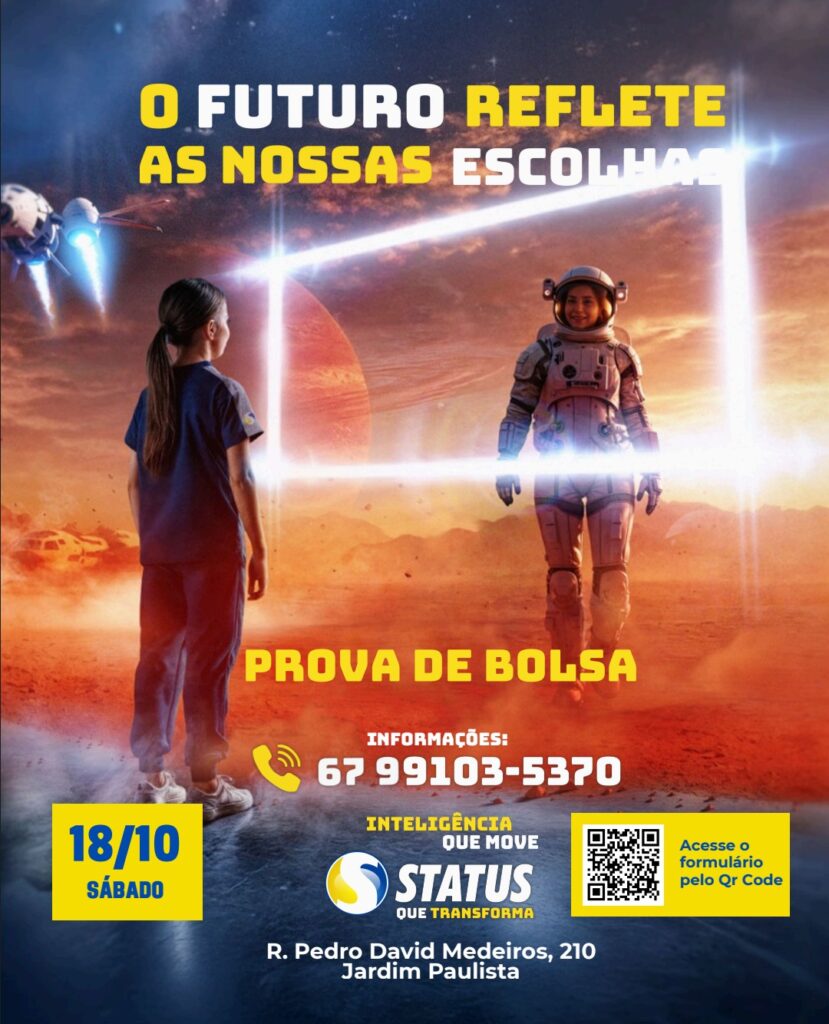 O futuro não é um acaso: ele é fruto das escolhas que fazemos no presente. É com esse espírito que o Colégio Status, referência em educação inovadora em Mato Grosso do Sul, abre as portas neste sábado, 18 de outubro de 2025, para dois grandes eventos que marcam o calendário educacional do estado: a Prova de Bolsas 2026 e o Aulão de Revisão ENEM – Plano B.