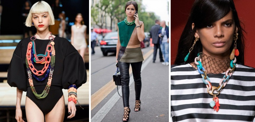 O plástico e o acrílico são materiais que estão ganhando os acessórios. Se antes as correntes estavam vindo em tamanhos menores e mais delicadas, geralmente aliada com metais, agora elas crescem em tamanho e ganham os tons da temporada como vermelho, rosa pink, verde limão e lilás hortênsia. “A correntaria carrega modernidade e pode ser mixada com correntes mais finas, longas e curtas. Por ser um acessório mais pesado, combina bem com peças lisas, podendo ser uma blusa de gola alta ou mesmo composições de moda praia, já que o combo correntes e lenços, também em alta, traz uma estética glampurosa”, comenta.