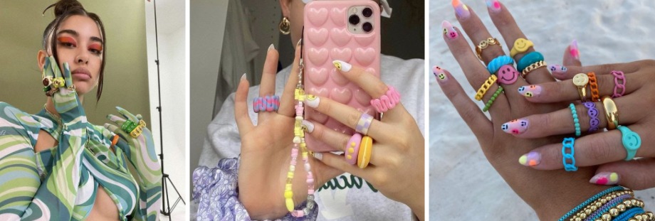 Com tamanhos grandes e cores chamativas, essa é uma tendência que pode gerar controvérsias, mas que ganha força desde a temporada passada. De acordo com Jana Lee, esse é um acessório que era muito comum na adolescência dos millennials e promete nostalgia com as releituras que chegam ao mercado. “É um acessório que traz uma estética mais infantil ou kidcore, podendo não se adequar a todos os estilos. Para fazer composições é legal investir em uma composição de vários anéis, com cores fortes mas que conversem entre si, podendo estes terem até mesmo desenhos diferentes como corações e frutas. Para manter a harmonia, o círculo cromático pode ajudar”, recomenda.