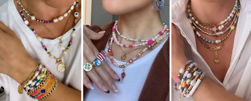 Seguindo a onda de peças resgatadas dos anos 2000, os acessórios de miçanga prometem continuar o colorido das composições. “Essa tendência também resgata muito a estética hippie dos anos 70 e pode vir em colares, pulseiras e até mesmo cordinhas de óculos. Por seguir a mesma estética infantilizada, são acessórios que costumam misturar muitas cores e vem acompanhadas de miçangas com letras. Essa estética é facilmente adaptável a quem opta por uma vestimenta mais contemporânea e casual. Casa bem com composições com jeans, camisetas e também tecidos artesanais como o crochê”, diz Jana Lee.