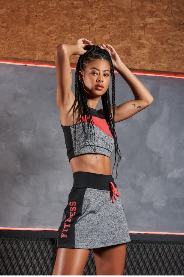 Está cansada de usar legging ou short que tal apostar no short saia, alem de ser super confortável ele confere um charme a mais ao look, com o top combinando o look fica perfeito.