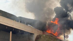 Acidente entre carretas tem fogo e motorista preso nas ferragens na saída de Campo Grande