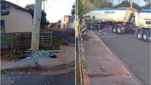 Carreta bate e deixa poste de iluminação pendurado em Nova Andradina