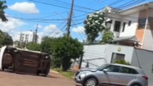 Colisão em cruzamento termina com carro tombado na Vila Carvalho