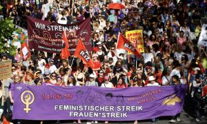 Da catedral de Lausanne, iluminada por luzes cor de rosa até as estátuas violetas de Neuchâtel, as mulheres suíças lançaram nesta sexta-feira (14) um dia de mobilização para exigir pagamento igual ao dos homens, denunciar a violência de gênero e defender o reconhecimento das tarefas domésticas. Assobiando e batendo panelas e frigideiras, centenas de manifestantes […]